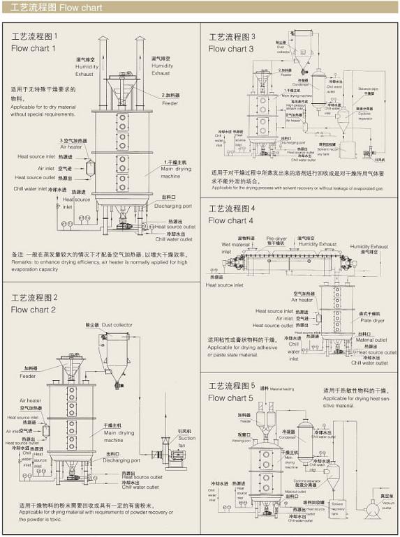 原理 : 濕物料自加料器連續地加到干燥器上部第一層干燥盤上,帶有耙葉的耙臂作回轉運動使耙臂作回轉運動使耙葉連續地翻抄物料。物料沿指數螺旋線流過干燥盤表面,在小干燥盤上的物料被移送到外緣,并在外緣落到下方的大干燥盤外緣,在大干燥盤上物料向里移動并從中間落料口落入下一層小干燥盤中。大小干燥盤上下交替排列,物料得以連續地通過整個干燥器。中空的干燥盤內通入加熱介質,加熱介質形式只有熱水和導熱油,加熱介質由干燥盤的一端進入,從另一端導出。已干燥物料從最后一層干燥盤落到殼體的底層,最后被耙葉移送到出料口排出,真空型盤式干燥器的濕氣由設在頂蓋上的真空泵口抽出。從底層排出的干物料可直接包裝。通過配加翅片加熱器、溶劑回收冷凝器、袋式除塵器、干料返混機構、引風機等輔機,可提高其干燥的生產能力,干燥膏糊狀和熱敏性物料,可方便地回收溶劑,并能進行熱解和反應操作。
